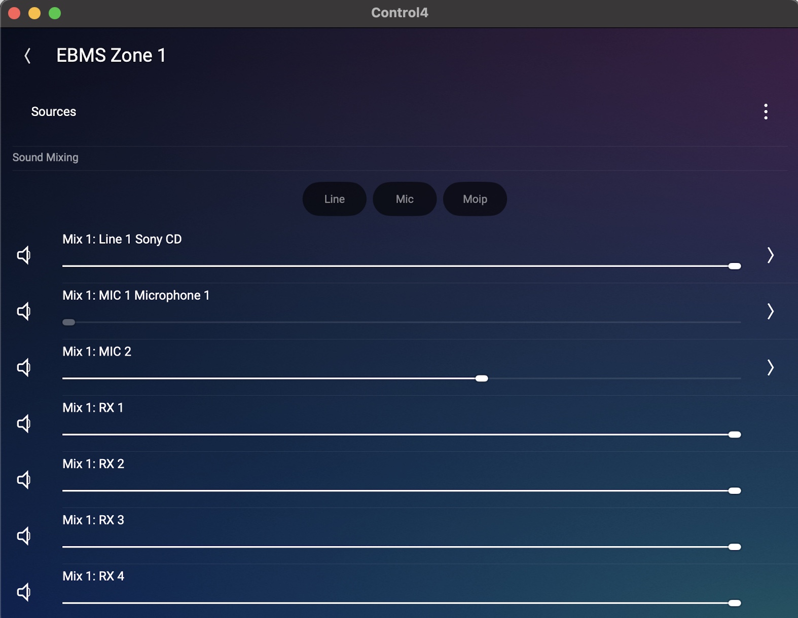 Furthermore, it may be desired to start an audio session by just selecting a Mix of channels and not have a particular selected (controllable) source. Or the user may wish to select a single microphone (not controllable) as the selected source. To handle these use cases, No Control drivers have been created for both Microphone and Mix.
